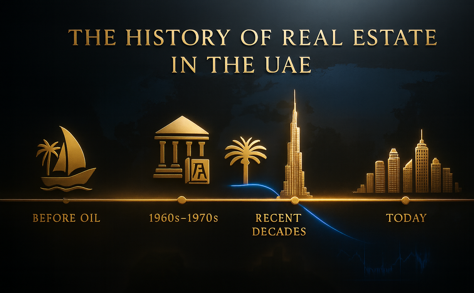 - قبل اكتشاف النفط في الإمارات في النصف الثاني من القرن العشرين، كان الاقتصاد المحلي يعتمد بشكل رئيسي على الصيد والزراعة والتجارة البسيطة. لكن مع تطور الاقتصاد وازدياد الحاجة إلى الإسكان والمرافق الحديثة، بدأت الحكومة الإماراتية في ستينيات وسبعينيات القرن الماضي بإنشاء هيئات حكومية متخصصة لتطوير العقارات وتنظيم السوق.